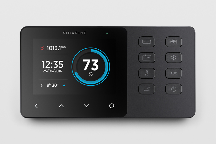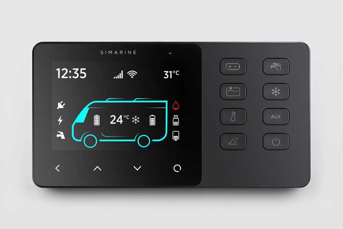 Simarine Caravan control panel je zařízení, které slouží k ovládání spotřebičů a monitorování stejnosměrných zdrojů energie, jako jsou baterie, sklonoměry, nádrže a solární panely vašeho karavanu. Informace se zobrazují na velkém 3,5" displeji IPS s vysokým rozlišením, sklem Gorilla Glass a antireflexní vrstvou, která zajišťuje vynikající viditelnost. Je vybaven 8 ovládacími tlačítky upravenými pro pohodlné užívání. Panel Caravan dokáže monitorovat až 6 baterií, 14 nádrží, 14 teplot a 20 nezávislých proudových čidel (bočníků) a ovládat 2 reléové spínače. Je vybaven modulem s aplikací dostupnou pro chytré telefony Android a iPhone. Aplikace umožňuje přístup k živým datům, analýzu uložených dat, konfiguraci panelu a provedení aktualizace firmwaru systému.
