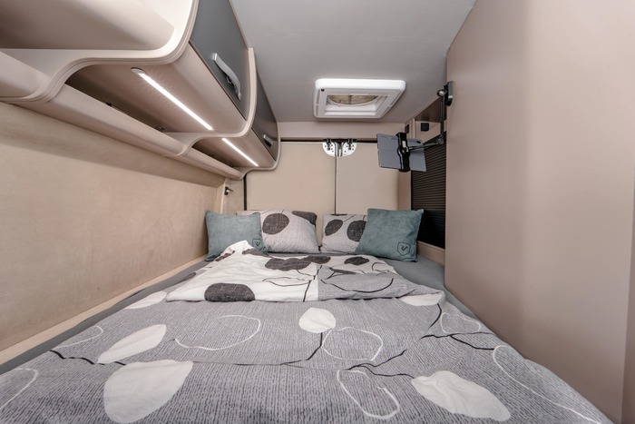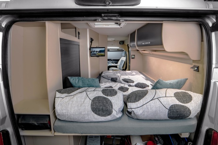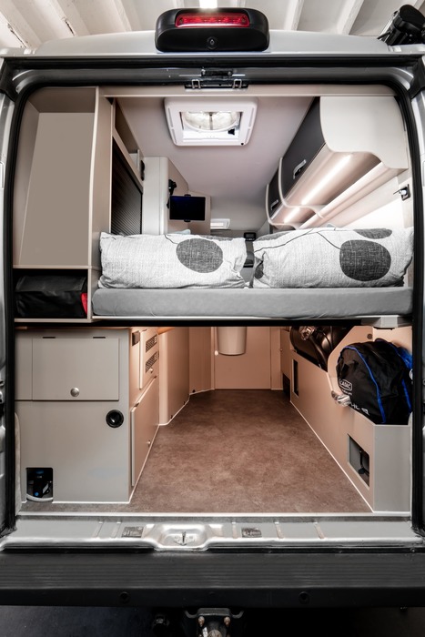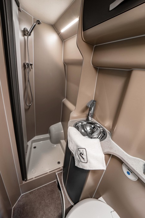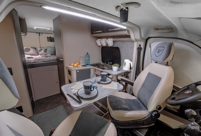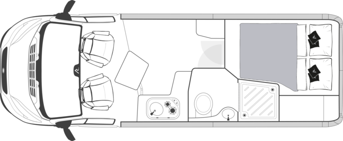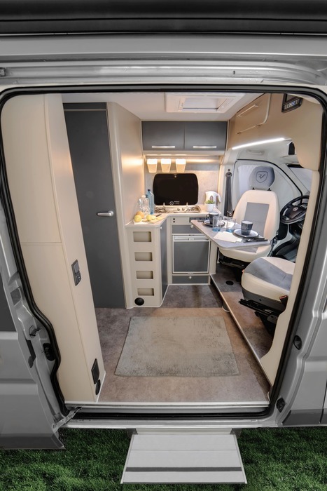 Obytné vozidlo EVO COMFORT je ideální pro dva cestovatele na jakkoliv dlouhé výlety, tak i jen na prodloužený víkend. Dominantou tohoto modelu je samostatná sprcha přístupná z kabinky koupelny. Dalším zajímavým místem je velký prostor u kuchyňky se sezením. Ve vozidle EVO COMFORT nechybí ani velká skříň na celou výšku vozidla se spoustou místa. Prostorné lůžko v zadní části vozidla uložené podél poskytne pohodlný prostor pro odpočinek se snadným přístupem i díky schůdku integrovanému do skříně. Vozidlo je vybaveno i speciální horizontální stolovou nohou, kterou jsme vyvinuli přímo pro tento půdorys. Díky tomu je přístup ke stolu a jeho manipulace velmi snadná. Příjemným bonusem stolu je možnost rozšíření pracovní desky kuchyně. Vedle lůžka v zadní části vozu je prostorná žaluziová skříň se spoustou místa pro oblečení. Pro případ, že chce tento model vybavit dalšími vyjímatelnými sedadly pro případné další cestovatele, můžeme na vůz namontovat zvedací střechu, která jim poskytne prostor pro denní útočiště, tak i pro noční odpočinek. Střešní stan může být vytápěný, čímž se prodlužuje využitelnost i do chladnějších období roku. Úložný prostor pod zadním lůžkem je dostatečně velký pro vše, co budete při svých cestách potřebovat. Samozřejmostí je přístup pod lůžko i z obytné části.