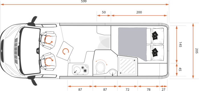 | Lůžka | Zadní pevné 145/115 x 200 cm | |